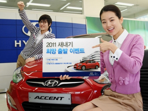 현대자동차(회장 정몽구)는 2월과 3월 출고 고객을 대상으로 디지털 가전 및 생활용품을 할인된 특가로 구매할 수 있는‘새봄맞이 출고 고객 특가구매 이벤트’를 진행하며, 2011년 새내기 고객 및 현대차 생애 첫 구매 고객에게 특별 할인 또는 사은품을 증정하는 ‘2011 새내기 희망 출발 이벤트’도 실시한다고 밝혔다.