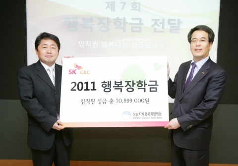 SK C&C(대표이사 정철길, www.skcc.co.kr)는 9일 경기도 성남시 정자동에 위치한 SK u-타워(본사) 27층 비전룸(Vision Room)에서 성남지역의 저소득 가정 청소년 48명에게 장학금 7,100만원을 수여하는 ‘행복장학금 전달식’을 가졌다고 밝혔다.