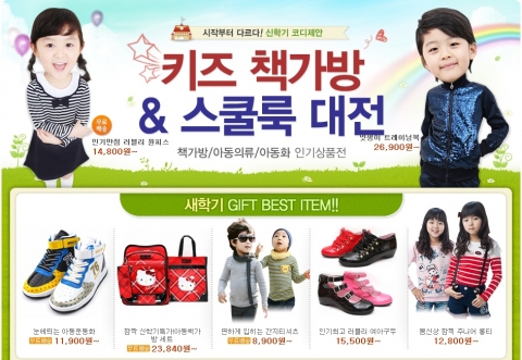 우선 ‘신학기 코디제안 키즈 책가방&스쿨룩 대전’을 오는 28일까지 열고, 아동의류, 책가방, 아동화, 실내화, 내의를 특가로 선보인다. 아동 스쿨룩 상하복(7900원~), 아동들이 좋아하는 파워레인저, 헬로키티 등 인기 캐릭터 아동책가방(1만4800원~), 어깨가 편한 휠팩 및 보조가방(2만8800원~), 아동내의(1500원~)을 최고 59% 할인된 가격에 만날 수 있다.