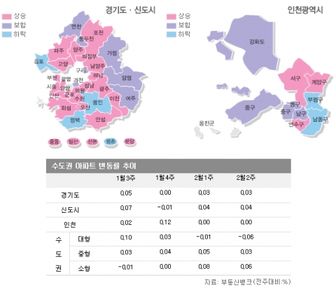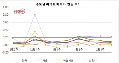 부동산뱅크 조사에 따르면, 2월 둘째주 전국 아파트값은 0.09% 올랐다. 17주 연속 상승이다. 여기에 ▲,서울 0.07%▲, 경기도 0.03%▲, 신도시 0.04%▲ 등 수도권 집값도 연일 강세다. 반면에 거래시장은 잠잠하다. 2월 시장을 지켜보고 매입에 나서려는 매수자들과 구정 후 집값이 오를 거라고 믿는 매도자들로 인해 거래가 이뤄지기 힘들기 때문이다.