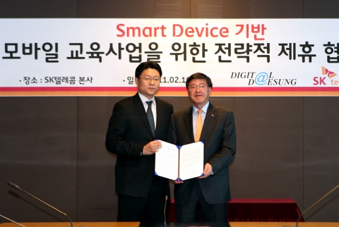 양사의 ‘Smart Device기반 모바일 교육사업’ 전략적 제휴 체결식은 SK텔레콤 본사 을지로2가 SK T타워에서 진행되며, SK텔레콤 박인식 기업사업부문장, 디지털 대성 최진영 사장 등 양사 주요 임원이 참석한다.