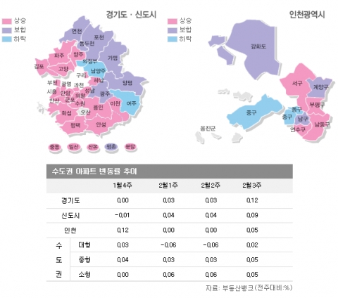 이밖에 신도시는 산본 0.15%▲, 분당 0.12%▲, 일산 0.09%▲, 중동 0.03%▲, 평촌 0.00% 등을 기록했고, 인천도 연수구 0.16%▲, 서구 0.08%▲, 부평구 0.07%▲, 남동구 0.04%▲ 등이 소폭 상승했다. 설 이후 추격매수가 붙지 못하면서 아파트 시장은 거래없이 호가만 상승하고 있는 양상이다.