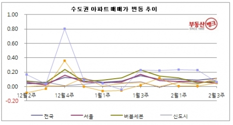 부동산 정보업체 부동산뱅크에 따르면 전국아파트값은 0.11%▲, 서울 0.05%▲, 경기도 0.12%▲, 인천 0.05%▲ 등 전반적으로 아파트값이 강세를 띠고 있다. 하지만 오르는 가격과 달리 설 이후 거래는 임대물건을 제외하고는 거의 없는 실정이다.