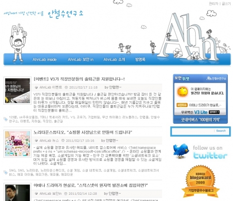 한편, 안철수연구소는 공식 블로그 외에도 사보 블로그 ‘보안세상’(http://blogsabo.ahnlab.com)을 운영함으로써 기업문화를 사내외에 전파하고 사회와 양방향으로 소통하고 있다. 이 밖에도 실시간으로 보안 위협에 대처하는 ASEC 대응팀과 ASEC 블로그(http://core.ahnlab.com, http://blog.ahnlab.com/asec)를 함께 운영하여 IT 트렌드와 보안 상황을 전해왔다.