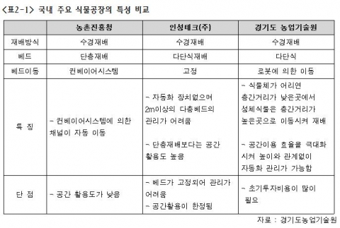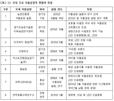 국내 식물공장은 아직 보급 초기단계이며 확대를 모색하고 있는 중이다. 식물공장은 초기 설립과 운영 비용이 많이 들고, 무농약인 만큼 작물의 재배 과정에서 새로운 병균의 전염 등에도 연구, 대비해야 하는 등 문제점과 과제 또한 많은 것으로 나타났다.