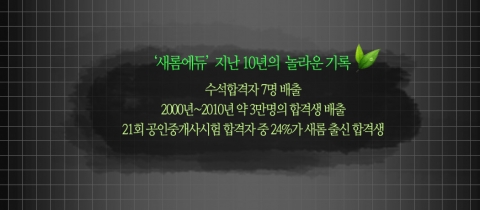 새롬에듀는 지난 10년간 3만여명의 공인중개사 합격생을 배출하였으며, 6차례 수석합격 배출, 7명의 수석합격생을 배출하였으며, 지난 21회공인중개사시험에서는 3,600여명의 합격생을 배출하였고, 스포츠서울의 공인중개사 부분 브랜드대상을 수상하는 등 외부로부터 그 우수성을 인정받았다.