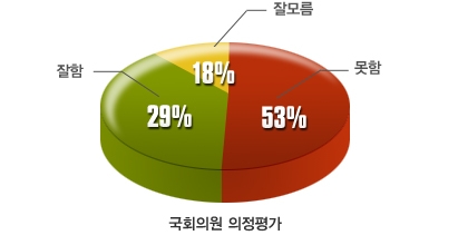 여론조사 전문기관 모노리서치(대표: 이형수)의 지난 17일 설문 결과, 지역 국회의원들의 최근 의정활동에 대한 평가로 전국 평균 53.0%가 ‘잘못함’, 29.0%가 ‘잘함’, 18.0%가 ‘잘모름’이라고 답했다. 지난달 18일 같은 조사와 비교할 때 ‘잘못함’은 0.6%p 상승하고, ‘잘함’은 2.4%p 하락한 결과다.