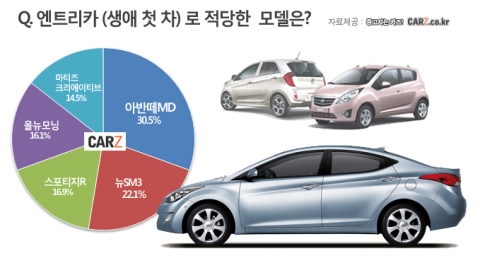 엔트리카 구입 시즌을 맞이하여 중고차사이트 카즈가 진행한 조사에 따르면 2030대 남녀의 52.6%는 ‘생애 첫 차에 적당한 차’로 ‘아반떼MD’, 뉴SM3 등 준중형차를 선택했다. ‘첫차 = 경,소형차’ 라는 공식은 깨졌다. 일반적으로 엔트리카 대표로 알려진 ‘올뉴모닝’과 ‘마티즈 크리에이티브’는 최하위를 기록하며 외면 받았다.
