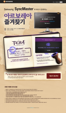 한게임은 2월 23일부터 3월 31일까지, 총 37일의 이벤트 기간 동안 열흘간 하루 1시간 이상 게임을 즐긴 게이머들 중 추첨을 통해 100명을 선정, <테라>의 환상적인 그래픽을 보다 생생하게 체험할 수 있는 삼성 싱크마스터 LED 모니터를 증정할 예정이다.