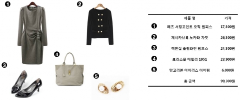여성은 단정하고 차분한 느낌을 주는 의상을 선택하는 게 좋다. 심플한 미니멀 스타일의 ‘레츠 셔링포인트 원피스(1만7800원)’와 금장단추로 포인트를 준 블랙 색상의 ‘제시카브룩 노카라 자켓(2만6800원)’을 추천. 여기에 블랙 색상의 ‘잭앤질 슬림라인 펌프스(2만4800원)’와 수납공간이 넉넉해 비즈니스용으로 어울리는 그레이 색상의 ‘크리스몰 에밀리 1951(2만3900원)’ 숄더백을 매치하면 보다 차분하면서도 스타일리시하다. 여기에 ‘망고리본 아이리스 이어링(6000원)’ 착용으로 여성미를 배가할 수 있다(총 9만9300원).