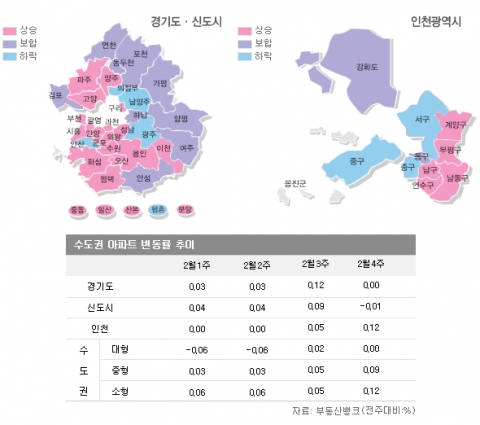 이밖에 인천은 남구 0.32%▲, 계양구 0.10%▲, 부평구 0.09%▲, 남동구 0.07%▲, 연수구 0.06%▲ 등이 소폭 상승했다. 부천이나 서울 서남권 지역에서 전셋집을 찾지 못한 수요자들이 유입되면서 가격에 움직임이 있었다. 그러나 전셋집을 찾는 사람들이 대부분이어서, 매매가격에 큰 변동은 없는 상태다. 신도시도 분당 0.12%▲, 군포시 0.10%▲, 일산 0.05%▲, 중동 0.04%▲ 등 큰 움직임 없이 소폭 상승장을 이어가고 있다.