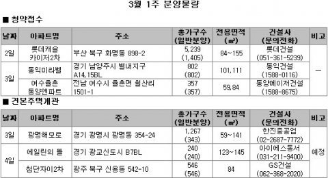 부동산뱅크에 따르면 3월 첫째 주에는 전국 3개 사업장에서 총 6,398가구가 공급되며, 이 중 2,564가구가 일반분양 물량이다. 여기에 광교신도시 테라스형 타운하우스와 경기 광명시 광육재건축사업장 등 3곳에서 견본주택이 개관될 예정이다.