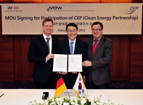 The initial agreement was signed yesterday in Seoul, attended by Dr. Hyun Soon Lee, Vice Chairman and head of Hyundai-Kia R&D; Dr. Klaus Bonhoff, Managing Director of NOW GmbH (National Organization of Hydrogen and Fuel Cell Technology); Patrick Schnell, Chairman of the Clean Energy Partnership (CEP) and other CEP members.