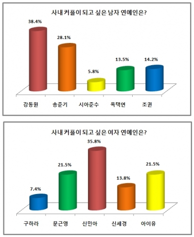 ‘사내 커플이 되고 싶은 여자 연예인’은 배우 신민아가 35.8%(380명)로 1위에 꼽혔다. 국민 여동생으로 불리는 탤런트 문근영과 가수 아이유는 21.5%(228명)로 동률을 기록했다. 신세경은 13.8%(147명), 카라의 구하라는 7.4%(79명) 이었다.