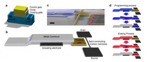 기존 플래시메모리는 실리콘 기반 트랜지스터의 ‘플로팅 게이트’ 방식이나 ‘차지 트랩 플래시(CTF)’ 방식으로 정보가 저장됐다. 이들 방식은 높은 전압을 트랜지스터에 걸거나 빼 전하를 주입하거나 제거함으로써, 트랜지스터 게이트에 흐르는 전류값을 변화시켜 메모리 단위인 비트를 1 혹은 0으로 구별하면서 정보를 저장하는 방식이었다. 그러나 연구진은 탄소나노튜브 트랜지스터 구조에 기존 플래시 메모리와 같은 플로팅 게이트를 위치시킨 다음 전기역학적 스위치의 온-오프(on-off)를 통해 전하를 게이트에 주입할 수 있도록 소자를 설계했다. 이렇게 구현된 메모리는 단지 전기적 신호에만 의존하는 것이 아니라 기계적 힘을 보완했기 때문에, 전하를 주입하거나 제거할 때 생기는 셀(cell) 간 간섭 현상으로 인한 오작동 위험이 없고 전력 소모를 줄일 수 있다는 게 연구진의 설명이다.