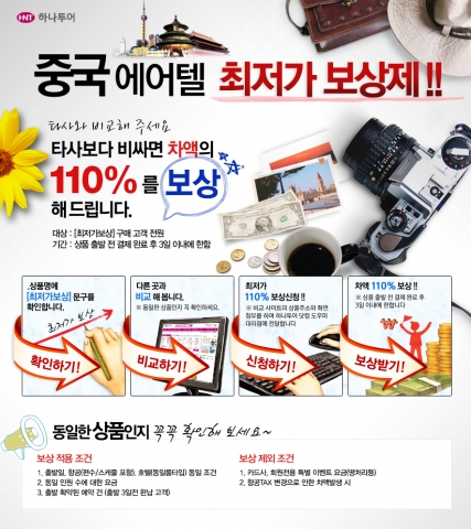 이는 [최저가 보상] 문구가 있는 하나투어 중국 에어텔 상품이 항공, 호텔 등 동등한 조건에서 타사보다 비쌀 경우 차액의 110%를 보상해주는 제도이다. 하나투어에서 항공과 호텔을 예약한 후 타사에서 저렴한 상품을 찾아 비교사이트의 상품주소와 화면을 첨부해 하나투어 예약 대리점에 전달하면 된다. 단, 카드사 할인 및 땡처리와 같은 회원전용 특별 이벤트 상품과의 비교는 예외. 하나투어가 선보인 ‘[최저가 보상] 상하이 자유 4일’은 24만9천원(TAX 불포함)부터 예약 가능하다.