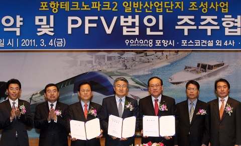 본 체결식은 경북 포항시 남구 연일읍 학전·달전리 일대 약 63만평에 자립형 신도시를 조성하는 ‘포항테크노밸리’(포항테크노파크 2일반산업단지) 조성사업에 필요한 PFV설립을 위한 것으로 이날 행사에는 박승호 포항시장과 정동화 포스코건설 사장, 서진원 신한은행장 등 출자기관 및 기업 대표자들이 모두 참석했다.