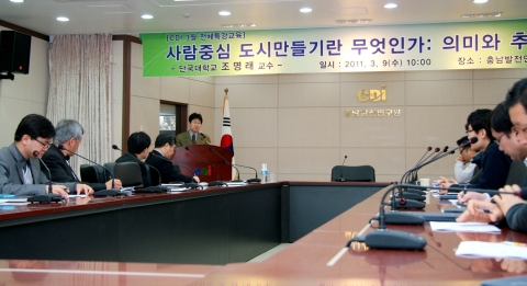 이에 충남발전연구원(원장 박진도)은 9일 오전 단국대학교 조명래 교수를 초청, “사람중심 도시만들기란 무엇인가: 의미와 추진방안”이란 주제로 특강교육을 가졌다.
