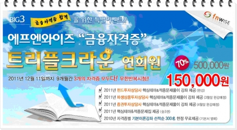 에프엔와이즈 관계자는 “자본시장통합법 시행으로 인한 금융시장의 개방화와 선진화로 금융전문인력의 수요가 급증하고 있다”며 “보다 많은 수험생들이 파격적 할인금액으로 금융3종 자격증을 획득할 수 있는 ‘트리플크라운’ 연회원을 통해 금융전문인력으로 발돋움 하길 바란다”고 밝혔다.