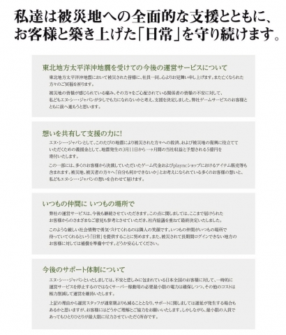 엔씨재팬(대표 박성준)은 17일 홈페이지 공지를 통해 “지진으로 피해를 입으신 분들께 직접적인 지원과 피해 지역의 복구에 힘이 될 수 있도록 지진 발생일인 3월 11일부터 1개월 간의 매출로 예상되는 5억엔(약70억 원)을 기부하기로 결정하였다”고 밝혔다.
