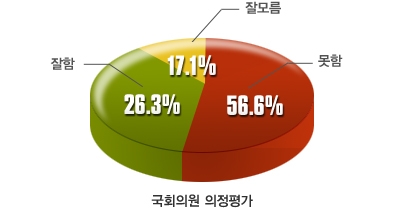 여론조사 전문기관 모노리서치(대표: 이형수)의 지난 15일 설문 결과, 지역 국회의원들의 최근 의정활동에 대한 평가로 전국 평균 56.6%가 ‘잘못함’, 26.3%가 ‘잘함’, 17.1%가 ‘잘모름’이라고 답했다. 지난달 17일 같은 조사와 비교할 때 ‘잘못함’은 3.6% 포인트 상승하고, ‘잘함’은 2.7% 포인트 하락한 결과다.