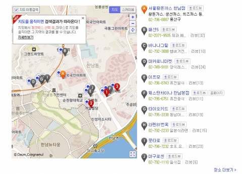 예를 들어, 이용자가 ‘한남동 맛집’을 검색한 후 다른 지역의 맛집 정보가 추가로 궁금할 경우, 검색결과로 제시된 지도를 이태원이나 압구정 등 다른 지역으로 이동하기만 하면 된다. ‘이태원 맛집’, ‘압구정 맛집’ 등으로 검색어를 일일이 바꿔서 검색하지 않더라도 이용자가 이동한 지도의 위치에 맞춰 검색 결과가 자동으로 변경된다.