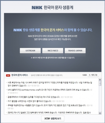 이에, 현지 방송을 완벽히 이해하기 어려운 재일 한국인들을 위해 네이버가 6명의 전문 동시통역사를 두고 실시간 NHK 방송에 대한 문자 생중계를 시작했다. NHK 방송을 실시간으로 볼 수 있는 링크 3개와 함께 문자 생중계 창에서는 한글자막으로 해당 내용을 즉시 확인할 수 있다. 해당 문자 생중계는 네이버 재팬(naver.jp) 페이지에서도 금일 중으로 서비스할 예정이며, 해당사항이 주일한국대사관과 주일본총영사관을 통해 체류중인 교민들에게 잘 전달될 수 있도록 외교통상부에도 지원을 요청했다.