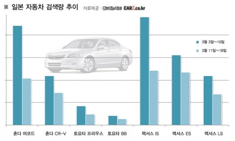 지진 발생일인 지난 11일 이후, 일본차에 대한 국내 관심도가 확연히 달라졌다. 중고차사이트 카즈의 자동차 모델별 검색순위를 살펴본 결과, 일주일 사이 일본 브랜드 수입차들의 조회량이 동반 하락한 것이다. 국내 인기모델인 렉서스 ‘iS’의 조회량은 49% 감소했고, 국내판매 1위를 기록하기도 했던 혼다 ‘어코드’ 역시 53%까지 떨어졌다. 피해지역에 대한 우려 섞인 성원을 보내는 것과 달리 소비자로서의 기준은 냉정해진 것이다.