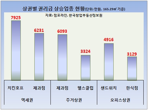 제과점 권리금이 1억7884만원에서 2억4115만원으로 6231만원(34.84%) 올라 뒤를 이었고 치킨점이 1억6750만원에서 1억7200만원으로 450만원(2.69%) 증가한 것으로 나타났다. 주거상권에서는 제과점 권리금이 1억6634만원에서 2억2727만원으로 6093만원(36.63%) 올랐다. 제과점은 역세권과 주거상권 모두 권리금이 6000만원 가량 오른 것으로 나타났다.