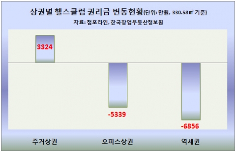 조사 결과에 따르면 역세권 소재 헬스클럽의 권리금은 1억4044만원으로 지난해 같은 기간 2억900만원에 비해 6856만원(32.8%) 내렸다. 오피스상권에 속한 헬스클럽도 1억7090만원에서 1억1751만원으로 5339만원(31.24%) 내렸다.