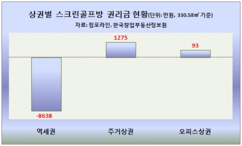 이 업종 권리금 동향을 보면 더 명확히 알 수 있다. 역세권 소재 스크린골프방의 권리금은 1년 사이 4억6388만원에서 3억7750만원으로 8638만원(18.62%) 내렸다. 이에 반해 주거상권 소재 스크린골프방은 3억4447만원에서 3억5722만원으로 1275만원(3.7%) 올랐다. 오피스상권 내 스크린골프방은 직장인 수요가 꾸준해 4억2000만원대 초반을 유지하는 등 시세 변동이 거의 없었다.