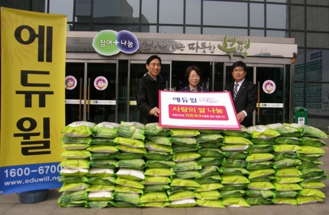 ‘사랑의 쌀’ 기증은 에듀윌의 연중 나눔 행사로 진행되고 있으며, 지난 1월에는 구로구종합사회복지관, 그리고 2월에는 서울 노원구청에 ‘사랑의 쌀’이 기증되었다. ‘사랑의 쌀’은 매월 각 지자체 및 사회복지관을 통해 생활이 어려운 이웃에게 전달된다.