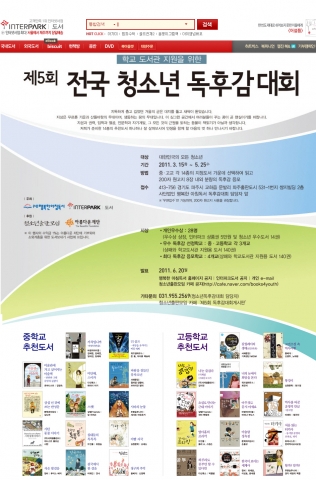인터파크도서와 (사)행복한아침독서의 주최로, 청소년출판모임, 아름다운재단이 후원하는 2011년 ‘제 5회 전국 청소년 독후감 대회’는 대한민국 청소년이면 누구나 개인이나 단체로 응모 할 수 있다.