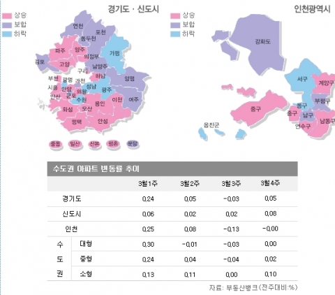 인천도 계양구 0.11%▲, 중구 0.06%▲, 연수구 0.02%▲ 등은 소폭 올랐지만 서구 0.16%▼, 동구 0.06%▼ 등은 하락했고, 신도시에선 평촌이 0.43%▲, 일산 0.05%▲, 부천 0.01%▲ 등이 소폭 상승했다.