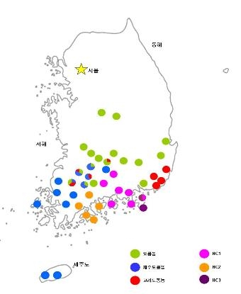 - 본 연구에서 처음으로 밝혀진 HC1, HC2, HC3의 경우, HC1을 제외한 HC2, HC3는 다른 종들과는 지리적으로 격리되어 있음을 알 수 있었다. HC2의 경우, 전라남도 순천, 보성, 고성, 여수 등지에서 서식이 확인되었으며, HC3의 경우, 경상남도 거제에 분포하고 있음이 확인되었다.