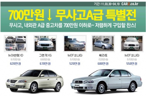 가장 저렴한 경차도 최소 900만원을 넘기는 요즘, 신차는 꿈도 꿀 수 없는 700만원 저예산으로 다양한 선택의 즐거움까지 누릴 수 있는 중고차 시장으로 눈길을 돌려보는 건 어떨까. 카즈의 ‘무사고A급 700만원 이하 할인전’은 오는 내달 19일까지 진행된다.