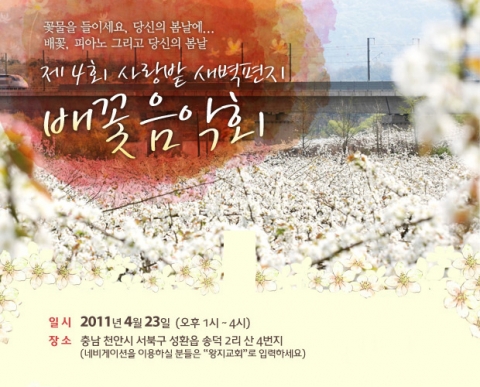 서울--(뉴스와이어)--올해로 4회차를 맞이하는 배꽃음악회가 오는 4월 23일 오후 2시 천안시 성환농장 야외 공연장에서 개최된다.