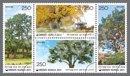 천연기념물로 지정된 ▲제주 산천단 곰솔 군 ▲금산 요광리 은행나무 ▲함양 학사루 느티나무 ▲하동 축지리 문암송을 우표에 담았다.