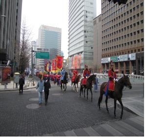 서울시는 현재 태평로 덕수궁 정문 앞에서 1일 3회 실시하고 있는 ‘왕궁수문장 교대의식 재현행사’ 중 말 2필이 출연하는 ‘기마대 순라 행렬’을 식목일부터 10월말까지 매주 화요일 오전 11시 행사에 실시한다고 5일(화) 밝혔다.