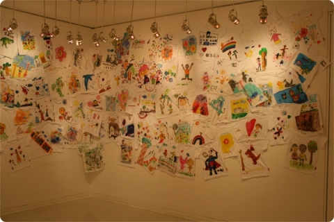 2500명의 어린이가 독도사랑을 표현한 그림은 재활용 골판지를 활용하여 그림엽서크기의 액자로 구성되어 있다.