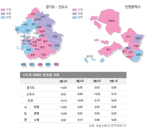 이밖에 경기도는 의왕시 0.37%▲, 연천군 0.33%▲, 군포시 0.22%▲, 광명시 0.17%▲, 수원시 0.16%▲, 용인시 0.15%▲ 등을 기록하며, 지난주에 비해 상승폭을 높였다. 인천에서는 연수구 0.67%▲, 남구 0.20%▲, 강화군 0.13%▲, 서구 0.07%▲, 부평구 0.03%▲, 중구 0.01%▲ 등이 소폭 올랐고, 신도시에선 산본 0.28%▲, 분당 0.08%▲만이 상승했다.