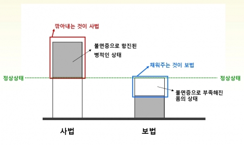 한의학에서는 사법(瀉法)과 보법(補法)의 치료법이 있다. 사법은 병증을 깎아 내리고 쳐내는 방법이고, 보법은 오랜 병증으로 인해 몸의 부족한 기운을 보호해주고 채워 넣어주는 방법이다. 한의학적으로 이런 몸의 노후화에 대해서는 전통적으로 보법을 써서 치료를 해 왔다. 하지만 수면제를 통한 치료에는 보법의 개념은 없고 사법의 개념만 존재하기 때문에 ‘잠은 자는데 몸은 더 피곤하다’라는 얘기가 나오게 되는 것이다.