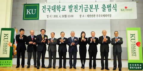 이날 출범식에는 이장무 전 서울대 총장, 윤형섭 전 교육부장관과 맹원재 동덕여대 이사장, 정길생 한국과학기술한림원 원장 등 3명의 전 건국대 총장, 김형식 서울국제학교 이사장, 루이스 이그나로 노벨상 수상 건국대 석학교수, 김경희 건국대 이사장과 김순도 건국대 총동문회장 등이 참석해 건국대발전기금본부의 출범을 축하했다.