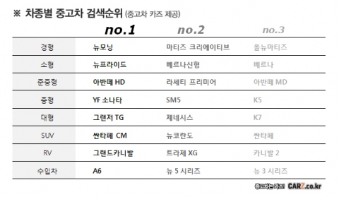 중고차 카즈가 발표한 검색순위에 따르면 경차-모닝, 준중형-아반떼, 중형-쏘나타, 대형-그랜저 등 신차판매 1위모델은 중고차 인기순위 역시 1위를 지키고 있다. 전차종 TOP10에 들지는 못하지만 묵묵히 차종 내 1위를 지키고 있는 소형-프라이드, CDV-그랜드카니발도 차종별 인기중고차 1위에 올랐다.