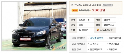 중고차사이트 카즈의 ‘대형차할인전’에서 판매중인 2010년 11월 등록 ‘K7’ VG350의 중고차 가격은 3,500만원. 무사고에 무난한 주행거리를 보유했지만 풀옵션 추가로 총 4,300만원이었던 신차가격이 6개월만에 20%가까이 낮아졌다. 같은 달 등록된 한국지엠 ‘알페온’의 동급 중고차가격이 신차대비 단 70만원 떨어진 것에 비교하면 아우의 아성에는 못 미치는 모습이다.