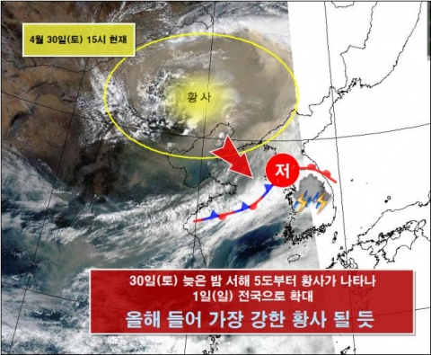 이번 황사는 올해 들어 가장 강할 것으로 예상되며, 1일 황사주의보가 발표될 가능성이 있고, 곳에 따라 황사경보로 확대될 가능성이 있음.