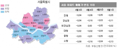 서울에서는 중구 0.05%▲, 성동구 0.05%▲, 은평구 0.02%▲, 종로구 0.01%▲ 등의 아파트값이 강세를 보인 반면, 양천구 -0.15%▼, 영등포구 -0.06%▼, 마포구 -0.02%▼, 용산구 -0.01%▼ 등 대부분의 지역들은 약보합세를 이어갔다.
