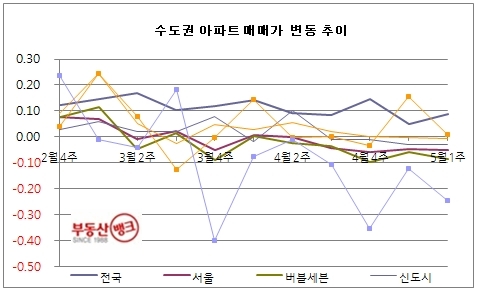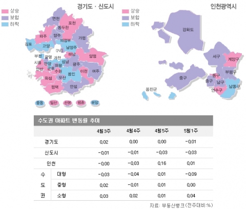 신도시는 5.1대책 후 산본 0.04%▲, 평촌 0.03%▲, 일산 0.02%▲ 등이 오른 반면, 중동 -0.34%▼, 분당 -0.01%▼등은 약세를 이어갔다. 한편, 인천은 동구 0.10%▲, 계양구 0.07%▲, 연수구 0.03%▲ 등이 오르면서 강세를 띨 수 있었던 것으로 보인다.