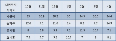 박근혜 한나라당 전 대표는 꾸준하고 안정적인 지지율을 보였지만 30대 유권자들의 지지가 아쉬웠고, 손학규 민주당 대표는 지지율 등락이 상당히 빠르고 진폭이 커 최근의 상승세 유지를 위한 방안 마련이 모색돼야 할 것으로 보인다. 유시민 국민참여당 대표와 오세훈 서울시장은 진폭과 변동이 큰 지지율 유지 및 상승 과제가 컸다.