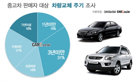 중고차사이트 카즈(http://www.carz.co.kr)가 홈페이지를 통해 접수된 중고차 판매문의를 분석한 결과, 판매희망자의 47%가 차량의 보유기간을 ‘3년 미만’이라고 답했다. 이들 중 ‘1년 미만’의 비율도 33%나 차지해, 차량의 교체주기가 기존보다 더 단축된 것을 알 수 있다.